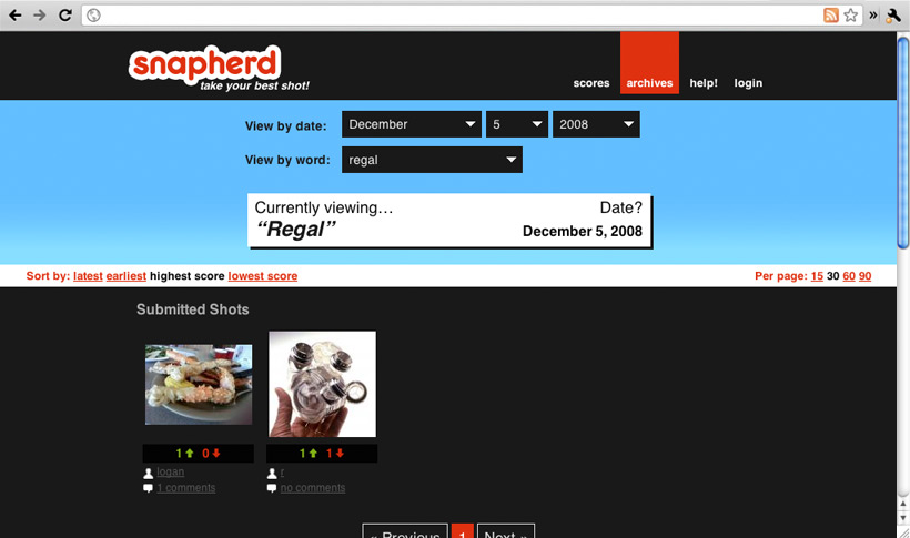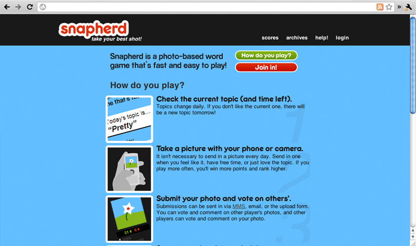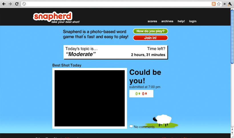 Snapherd was a social experiment that allowed users to submit photos from their computer or phone. The subject of the photo was defined by a "daily word," giving structure to the photos. Other users could then vote for their favorite photos on a daily basis.